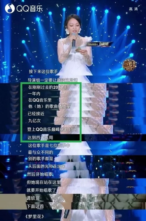 《歌手》2018第一期,串講人張韶涵就使用“QQ音樂播放量9億歌手”的標(biāo)簽自證樂壇地位,也側(cè)面印證了QQ音樂的播放量之大。在第三期節(jié)目,汪峰演唱完曲目《下墜》后,一句“要到QQ音樂查看收聽量”,同樣無痕植入QQ音樂,把此歌原唱的評論實現(xiàn)從零到2萬+的飛躍。