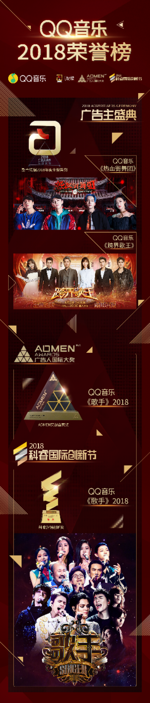 除了《熱血街舞團(tuán)》和《跨界歌王》第三季,QQ音樂與《歌手》2018的合作也同樣亮點不斷,成績不俗,這同樣為它在“ADMEN實戰(zhàn)金案獎”和“科睿營銷創(chuàng)新獎”的評選中一舉獲勝。