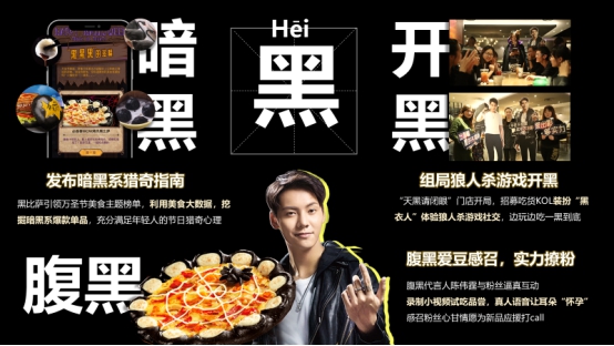 2017年10月,美團(tuán)點(diǎn)評與必勝客共同攜手,借勢萬圣節(jié)熱點(diǎn),圍繞著“黑”進(jìn)行了腦洞大開的創(chuàng)意發(fā)散。從產(chǎn)品視覺、明星形象、社交游戲三個(gè)維度進(jìn)行全方位的傳播互動(dòng),并且充分調(diào)用了美團(tuán)點(diǎn)評平臺(tái)的美食大數(shù)據(jù)優(yōu)勢,將“黑”從一種單一的視覺顏色變成一種風(fēng)格、性格與生活方式。最終,黑出彩才夠WOW,必勝客萬圣節(jié)新品‘黑’營銷”案例由此而生,深受95后年輕消費(fèi)者熱捧,并榮獲跨媒體整合營銷銀獎(jiǎng)。