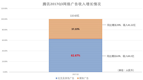 11月15日,騰訊公布2017年第三季度財(cái)報(bào)業(yè)績(jī)。截止2017年11月15日,騰訊第三季實(shí)現(xiàn)營(yíng)業(yè)收入652.1億元,同比增長(zhǎng)61%。其中,網(wǎng)絡(luò)廣告業(yè)務(wù)2017年第三季的收入同比增長(zhǎng)48%至人民幣110.42億元。