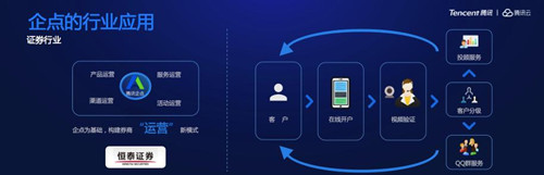 【企點效果】 客戶在移動端看到證券產(chǎn)品的推薦,點擊在線開戶,實時審核,在線雙向視頻驗證,驗證通過后通過客戶畫像做分群,活躍客戶分配給投資顧問做一對一精準(zhǔn)服務(wù),潛在用戶通過群服務(wù)的方式激活。而這整個客戶運營流程都是通過企點承載和構(gòu)建的。而這其中的視頻驗證應(yīng)用到了騰訊云的視頻服務(wù)和金融云存儲服務(wù),客戶畫像分級整合了大數(shù)據(jù)的服務(wù)能力。這就是證券行業(yè)的企點“運營”模式。