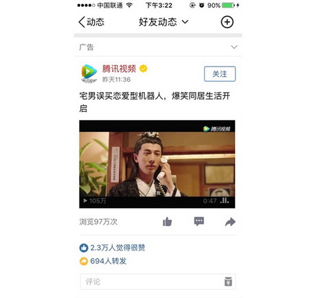 《我女朋友的男朋友》是一部女性視角的二次元網(wǎng)劇,騰訊社交大數(shù)據(jù)結(jié)合故事和“二次元”人群特征,將潛在人群精確拆解為“年齡(10-25歲)+性別(女性)+興趣(娛樂、動漫)”三大維度,在90后、95后最主要的信息交流平臺QQ空間進(jìn)行定向投放。通過娛樂、年輕化的內(nèi)容,在預(yù)熱期便實現(xiàn)了562萬曝光和6.52%點擊率,同時成功引流落地頁,關(guān)注劇集專題頁,成為開播一周即突破4000萬播放量的關(guān)鍵。
