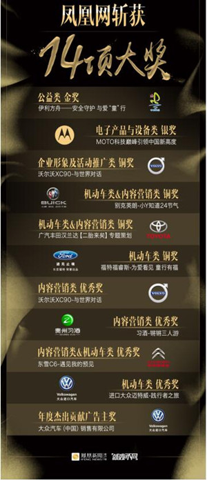 此外,《東雪C6-遇見我的預(yù)見》、《進(jìn)口大眾邁特威-踐行者之旅》、《習(xí)酒-鏘鏘三人游》等案例獲得優(yōu)秀獎(jiǎng),鳳凰網(wǎng)客戶大眾汽車(中國)銷售有限公司獲評年度杰出貢獻(xiàn)廣告主大獎(jiǎng)。