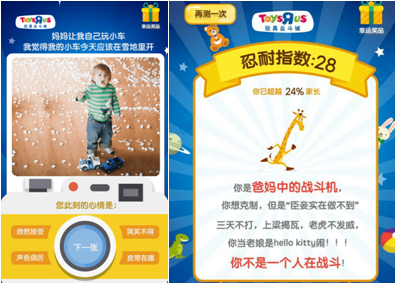 在主會(huì)場中,各類直擊年輕父母育兒痛點(diǎn)以及笑點(diǎn)的互動(dòng)游戲,不僅提供爆笑娛樂體驗(yàn),更與父母們產(chǎn)生情感共鳴。其中,微信H5互動(dòng)小游戲《最能忍大挑戰(zhàn)》通過一系列令人崩潰的“熊孩子”搗蛋圖片來測試父母們對(duì)“熊孩子”的忍耐度:墻壁作畫、枕芯散花、肉醬當(dāng)面膜……一幕幕似曾相識(shí)的場景博得家長們的會(huì)心一笑。這種娛樂促銷一體的體驗(yàn)不僅弱化了節(jié)日的促銷感。同時(shí),互動(dòng)游戲-購物優(yōu)惠券-主推產(chǎn)品層層遞進(jìn)式的引導(dǎo)也更有助于將線上流量導(dǎo)流至線下,實(shí)現(xiàn)銷售的轉(zhuǎn)化。