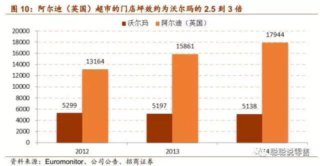 按奧樂(lè)齊平均門(mén)店面積650平米估算, 16年奧樂(lè)齊的門(mén)店坪效可達(dá)12570美元/平米。按英國(guó)分公司所公布的數(shù)據(jù)來(lái)看,12年、13年、14年奧樂(lè)齊(英國(guó))的門(mén)店坪效分別達(dá)到13164美元/平米、15861美元/平米和17944美元/平米,遠(yuǎn)高于沃爾瑪對(duì)應(yīng)年份的5299美元/平米、5197美元/平米和5138美元/平米。