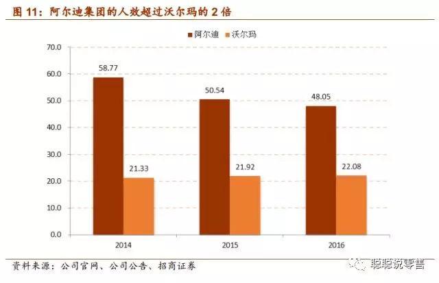 較高的員工工作效率使奧樂(lè)齊的人效始終保持較高的水平,雖然近年由于不斷向其他國(guó)家擴(kuò)張使奧樂(lè)齊的人效有所下降,但2016年奧樂(lè)齊的人效依然高達(dá)48.05萬(wàn)美元/人,約為沃爾瑪?shù)?.2倍多。