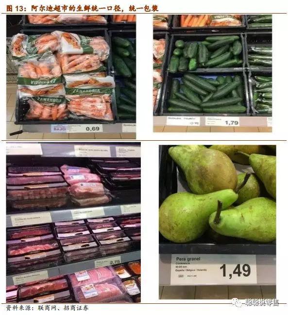具體來(lái)看,蔬菜基本是按照單位包裝好的,價(jià)格既定,例如一袋胡蘿卜的重量就是1KG,價(jià)格就是0.69歐元,這樣基本上是拿了就走,大大減少了消費(fèi)者挑揀的時(shí)間;水果嚴(yán)格按照果徑規(guī)格分類(lèi),每類(lèi)規(guī)格按照標(biāo)準(zhǔn)控制在一定范圍內(nèi),然后根據(jù)不同規(guī)格直接標(biāo)價(jià)銷(xiāo)售。通過(guò)生鮮產(chǎn)品高度標(biāo)準(zhǔn)化,降低了損耗成本,提升了購(gòu)買(mǎi)效率,同時(shí)也提高了客單價(jià)。目前,奧樂(lè)齊的生鮮品類(lèi)的銷(xiāo)售占比約為18%。