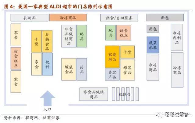 相較其他百貨公司在商品品類(lèi)上的全覆蓋,奧樂(lè)齊則聚焦于食品雜貨,同時(shí)輔以生鮮品類(lèi)。另外每周或每?jī)芍?,奧樂(lè)齊會(huì)向顧客提供非食品類(lèi)商品,如廚房用品、文具、針織品、收音機(jī)和電腦等。從商品陳列來(lái)看,以美國(guó)一家典型的奧樂(lè)齊超市為例,超市入口直面零食、飲料這種選購(gòu)率很高的商品類(lèi)別,此外超市會(huì)將冷凍商品及非食品促銷(xiāo)商品擺放在靠近結(jié)賬臺(tái)的地方,以方便消費(fèi)者的選購(gòu)。