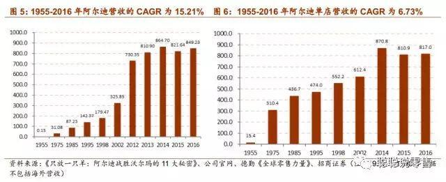 從數(shù)據(jù)上看,1955年奧樂(lè)齊營(yíng)收僅為0.15億美元,至2016年已高達(dá)849.23億美元,年均復(fù)合增長(zhǎng)率為15.21%。單店方面,2016年公司實(shí)現(xiàn)單店?duì)I收817萬(wàn)美元,自1955年以來(lái)的年均復(fù)合增長(zhǎng)率6.73%。