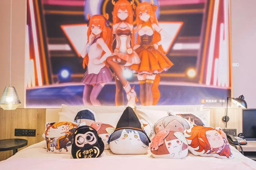 主題房墻壁上印滿了鹿娘的各種形象,粉色的床單、墻壁、窗簾把整個(gè)房間的少女氣息襯托得淋漓盡致。藏在床邊地板上碩大的粉色喬巴圖能帶給《海賊王》粉絲們驚喜。另外,《陰陽(yáng)師》中般若、晴明、黑達(dá)摩、妖刀姬等大家喜愛的角色化身Q版抱枕,被擺放在房間的各個(gè)角落。