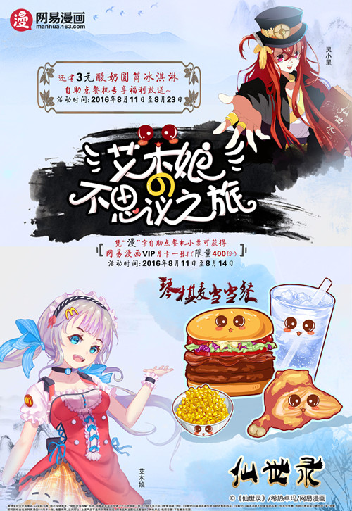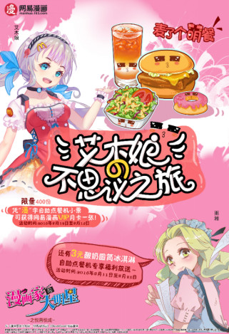 16年之初,網(wǎng)易漫畫就曾聯(lián)手麥當(dāng)勞啟動(dòng)“艾木娘の不思議之旅”IP跨界合作。合作基于網(wǎng)易漫畫站內(nèi)的超人氣IP進(jìn)行線下主題餐廳改造,上海麥當(dāng)勞4家餐廳融入網(wǎng)易漫畫作品中特色元素。繼麥當(dāng)勞之后,網(wǎng)易漫畫也和肯德基必勝客聯(lián)手,創(chuàng)造漫畫的場(chǎng)景化體驗(yàn)。
