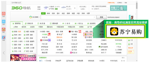 第一步:高性價(jià)比搶占日常流量,讓消費(fèi)者隨時(shí)找到品牌入口。在818活動(dòng)開始前,借助360導(dǎo)航名站、酷站等底層流量資源的長(zhǎng)期曝光,蘇寧成功占領(lǐng)固定流量入口,高性價(jià)比的滿足日常流量需求,完成日常流結(jié)構(gòu)的搭建。