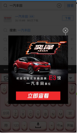 與此同時(shí),一汽豐田奕澤IZOA還在線上打造了一場別出心裁的營銷活動(dòng)。4月25日起,當(dāng)用戶使用搜狗輸入法輸入“奕澤”、“豐田”、“車展”等關(guān)鍵詞時(shí),一汽豐田奕澤IZOA的品牌廣告會(huì)實(shí)時(shí)呈現(xiàn)在用戶前面,為感興趣的用戶提供一鍵直達(dá)的快捷入口。