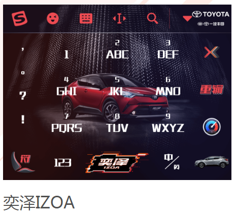 搜狗還為一汽豐田奕澤IZOA打造了專屬的輸入法皮膚,不僅在視覺上與一汽豐田奕澤IZOA進(jìn)行了呼應(yīng),還提供了全鍵盤及九宮格兩種形式,細(xì)致、周全的貼合用戶使用習(xí)慣。同時(shí),用戶點(diǎn)擊相應(yīng)的功能鍵,還將有浮層的展現(xiàn)形式,進(jìn)一步加深用戶的記憶度并更直接地關(guān)聯(lián)到品牌信息。