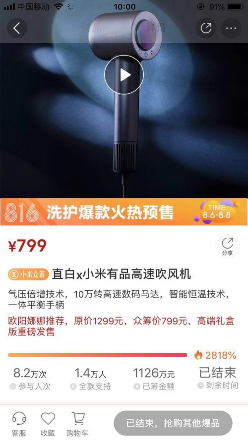 一經(jīng)上線,堪稱“掌上小風(fēng)暴”的直白高速吹風(fēng)機(jī)就突出重圍,以獨特的“黑科技”和媲美國際大牌的質(zhì)感,成功引爆眾籌平臺,直至眾籌結(jié)束已售出超過14000臺。憑借這一傲人的成績,直白高速吹風(fēng)機(jī)成功入局高端市場,為競爭日益激烈的吹風(fēng)機(jī)行業(yè)注入了新的生命力。