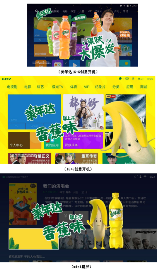 對于美年達(dá)來說,這部分用戶無疑正是其需要觸達(dá)的核心用戶。為此,美年達(dá)×小米在OTT端根據(jù)品牌傳播節(jié)奏,分別為美年達(dá)果味大爆發(fā)與香蕉味新上市,定制OTT創(chuàng)意15+5開機(jī)和mini霸屏,向消費(fèi)者展示超強(qiáng)視覺體驗(yàn)快速引爆新品上市的信息建立品牌強(qiáng)曝光,幫助品牌在大屏搶占消費(fèi)者的關(guān)注。