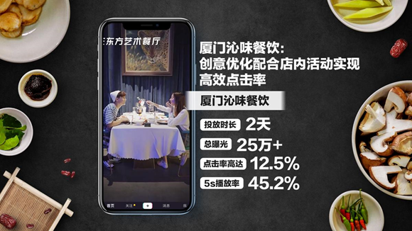 廈門沁味餐選擇投入品牌產(chǎn)品作為主要推廣對象,配合節(jié)日節(jié)點(diǎn)以及店內(nèi)定期活動以增加曝光量。投放時(shí)常2天,總曝光25萬+,點(diǎn)擊率高達(dá)12.5%,5s播放率達(dá)到45.2%,這一成果同樣基于抖音TopView的精準(zhǔn)定位推廣模式以及強(qiáng)勢的開屏霸屏短視頻,其推廣方式成功幫助企業(yè)在短時(shí)間內(nèi)打開品牌知名度,也通過品牌對產(chǎn)品的投放和店內(nèi)大量優(yōu)惠活動等迅速帶來客流量。