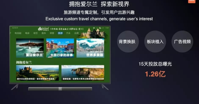 “一旦用戶的興趣被激起,我們迅速放大興趣點(diǎn)”。陳高銘介紹,在愛爾蘭旅游局的合作中,我們發(fā)現(xiàn)用戶對于旅游的喜愛度很高,流量是不請自來的狀態(tài)。這說明小米OTT背后的用戶對于旅游相關(guān)的內(nèi)容有需求。我們迅速決策打造了旅游頻道,將愛爾蘭的內(nèi)容定制在其中。這個內(nèi)容的出發(fā)點(diǎn)是TOC的,而TOB方達(dá)到共贏,小米營銷起到的是連接的作用。