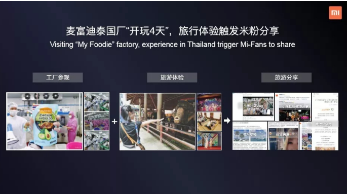 隨后,陳高銘分享了來自麥富迪泰國場“旅行冒險+工廠參觀”的合作。這可謂是產(chǎn)業(yè)與旅游的深度結(jié)合,將用戶邀請到工廠的腹地,既可以讓用戶了解到產(chǎn)品生產(chǎn)的過程,深入品牌的內(nèi)核。同時也借助米粉的社群屬性,把這個高光的內(nèi)核分享出去。
