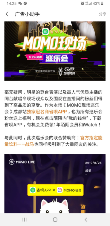 ??為了更好的宣傳戰(zhàn)馬品牌,在巡樂會(huì)成都站舉辦之前,陌陌就通過特別制作的巡樂會(huì)邀請(qǐng)函對(duì)戰(zhàn)馬進(jìn)行充分展示,用戶在打開邀請(qǐng)函時(shí),就會(huì)看到戰(zhàn)馬的品牌,不斷加深印象。同時(shí),在巡樂會(huì)的直播開始之前,戰(zhàn)馬的貼片廣告也會(huì)多次播放,讓用戶對(duì)其有進(jìn)一步進(jìn)行了解。