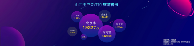 不僅如此,通過今日頭條發(fā)現(xiàn),山西用戶喜愛周邊游,最關(guān)注的旅游省份分別是北京、河南、河北三地。那么山西哪些地方的用戶會(huì)更關(guān)注旅游相關(guān)資訊呢?答案是太原、運(yùn)城、長(zhǎng)治,用戶可通過今日頭條、抖音短視頻了解到更多全國(guó)新鮮的旅游資訊,為自己未來的出行旅游攻略打下了堅(jiān)實(shí)的基礎(chǔ)。