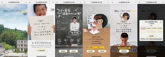 點(diǎn)擊進(jìn)入H5后,孩子們的詩歌便逐一展現(xiàn)在眼前?;怼爸谱魅恕钡挠脩糁恍鑴觿邮种高x擇心儀的詩詞與樂曲即可試聽并開始錄制唱片。唱片錄制成功后,制作人會得知唱片背后的公益詳情,以購買唱片的方式實(shí)現(xiàn)詩歌課程的捐贈,支持孩子們健康成長。還可以將自己制作的歌曲海報(bào)一鍵分享到朋友圈,吸引更多朋友的關(guān)注。