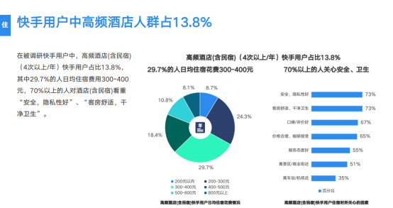 除租房體驗(yàn)外,快手用戶同樣關(guān)注酒店/民宿的居住質(zhì)量。數(shù)據(jù)顯示,高頻酒店(含民宿)(4次以上/年)快手用戶占比13.8%,其中29.7%的人日均住宿費(fèi)用達(dá)300-400元,70%以上的人對(duì)酒店/民宿看重“安全,隱私性好”、“客房舒適,干凈衛(wèi)生”。
