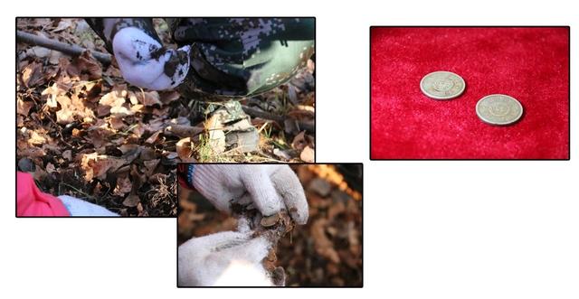 進入老黑河遺址區(qū)域,首先看到的就是此前我們曾多次介紹過的水井,循上望去便是用石頭壘的整齊的石墻和堡壘,即為主城。"快來看!"隨著宣傳部長孟凡迎的一聲驚呼,考察組一行圍攏到一起,扒開落葉,一處洞口得見天日,定睛一看是個炕灶,沒有完全坍塌的原因竟是內(nèi)有鐵質火車零件支撐。像是天意昭昭,又像是一分耕耘、一份收獲,老黑河遺址像是一份待啟的寶藏,把一件件物品挾裹出來,還原歷史與真相。此次考察,在2萬多平方米的主城墻上,長出了一株百年大青楊,距地面1米半處掛了斷鐵絲網(wǎng),看來樹下還埋著鐵絲網(wǎng),同行的財政局長崔賢凱在那扒拉,我怕他扎手,就過去幫他扒土,一下露出了兩枚"大滿州國銀幣",年份為大同二年壹角硬幣、康德五年壹角硬幣。在打石場處,又揀到鞋跟爛沒,鞋底脫落的女式半高跟皮鞋一只,結合前不久發(fā)現(xiàn)的生產(chǎn)于廣州的民國時期"歐陽戊隆香草油"高級化妝品,使我們一行百思不解,1940年日軍把鐵路修到這,僅僅是為了伐木掠奪資源嗎?他們?yōu)槭裁匆绱藝烂茉O防?為什么撤退時又放火毀滅這里?我們在主城下,占地千平的前沿指揮所,發(fā)現(xiàn)了一口井,井周邊用木板搭橋,大部分板子被燒焦了,可見當時火勢之猛。此行,還拾有水壺殘骸一件、平底鍋一個、籮底網(wǎng)一張。對比以往生活、戰(zhàn)斗物資的發(fā)現(xiàn),此次偽滿錢幣的種類擴增,值得探究。除物品外,在老黑河遺址還發(fā)現(xiàn)兩處深約1.5米的地下洞口,四周腳跺為清脆的空心聲,似地下排氣口,似有地下工程,等待考古專家破解。