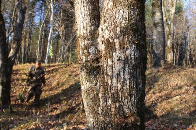 我們一行人下車步行,在崎嶇的山路中,發(fā)現(xiàn)了此行的第一個"寶貝"——榫卯結構的火車枕木。據(jù)文獻記載,1940年日偽將森林小鐵路修至老黑河遺址前后,對這一地區(qū)的木材進行采伐掠奪近五年之久。1945年,日軍撤退時放火將其燒毀。我們此行所走的山路,有數(shù)公里長的一段就是當年的鐵路,現(xiàn)在仍可見碎石底路基,而火車枕木的發(fā)現(xiàn)更是證實了這一點。枕木的發(fā)現(xiàn),讓我們一行非常興奮,因為:這是原物,是歷史與真相!要把枕木保護收藏起來,一部分要在博物館展出;另一部分則要與筑路碎石一同在發(fā)現(xiàn)處展出,高度還原,讓游客和后人知道80年前日本人是使用什么路基,在東三省是用何種方式運輸掠奪物資的!