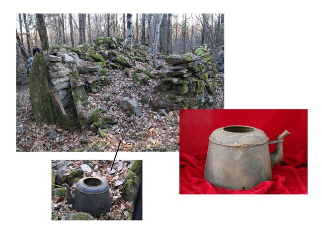 我們順著山路步行一個小時左右,抵達了漫江源頭——老黑河,竟發(fā)現(xiàn)逆水而上的漫江在源頭著改了流向奔東去了,同行的本地干部楊來革告訴我們,偽滿地圖標注此地為轉頭山,老黑河轉了一個大圈才向西回到漫江。老黑河東北幾百米的山上就是遺址群,依山而建、與河對望。來到此地,就不難想到《抗日名將王德泰》書中,曾寫到的東北抗日聯(lián)軍的著名將領、二軍軍長王德泰曾在老黑河密營中養(yǎng)傷,少年營為其抓蝲蛄補身體,如是此地,這河水距密營也太近了。