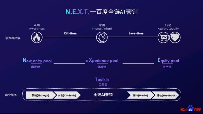 全鏈不只是廣告主的營銷全鏈,還有用戶的消費(fèi)全鏈。百度通過AI賦能,在用戶對(duì)品牌認(rèn)知的初始階段通過“需求激發(fā)池(New entry pool)”對(duì)其“賦予需求”,在用戶產(chǎn)生購買意圖的時(shí)候由“營銷體驗(yàn)池(eXperience pool)提供沉浸式體驗(yàn),在產(chǎn)生購買或留資等行動(dòng)時(shí),縮短用戶的行動(dòng)鏈條,并將用戶數(shù)據(jù)沉淀在“品牌資產(chǎn)池(Equity pool)”中,為品牌的后續(xù)營銷打基礎(chǔ)。