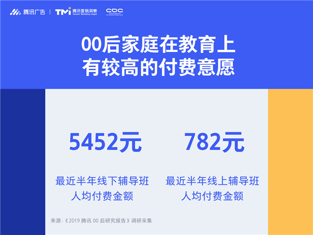 根據(jù)《2019騰訊00后研究報(bào)告》,00后家庭的教育付費(fèi)意愿較高。近半年,有超過(guò)50%的00后選擇通過(guò)學(xué)科輔導(dǎo)班、興趣班來(lái)提升學(xué)習(xí)能力、豐富自己的課余時(shí)間;00后學(xué)生在線(xiàn)下輔導(dǎo)班的人均花費(fèi)為5452元,線(xiàn)上為782元。