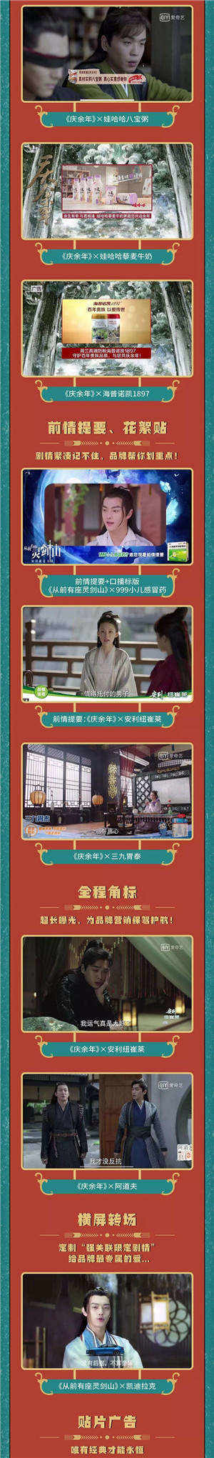 為滿(mǎn)足品牌的個(gè)性化需求,愛(ài)奇藝打造了多元化的廣告產(chǎn)品營(yíng)銷(xiāo)矩陣,助力品牌廣告投放精準(zhǔn)觸達(dá)目標(biāo)受眾。如通過(guò)劇中主角花式口播,將蘇寧易購(gòu)、毛豆新車(chē)網(wǎng)同城藝龍等品牌賣(mài)點(diǎn)傳遞給觀眾的原創(chuàng)大頭貼廣告;以及精準(zhǔn)識(shí)別貼合劇情的點(diǎn)位,將999小兒感冒藥、肛泰與劇情無(wú)縫銜接的創(chuàng)可貼廣告;也有從視覺(jué)和聽(tīng)覺(jué)搶占用戶(hù)心智的娃哈哈八寶粥、娃哈哈藜麥牛奶、海普諾凱1897的鳴謝貼廣告;還有通過(guò)暖心的精彩劇情回顧,將三九胃泰、999小兒感冒藥等品牌核心訴求高強(qiáng)度輸出的前情提要、花絮貼廣告;更有高強(qiáng)度曝光,提升用戶(hù)記憶度,讓阿道夫、安利紐崔C位出道的全程角標(biāo)廣告;除此之外,還有在黃金時(shí)段出現(xiàn),大大提升了觀眾對(duì)舒膚佳、奧利奧、方太、康師傅、戴森等品牌認(rèn)知的貼片廣告。