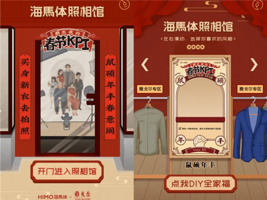 點開鏈接,就可以看到海馬體照相館的門口,“鼠碩年豐春意鬧,買身新衣去拍照”的春聯(lián)緊扣產品又不失趣味。點擊“開門進入照相館”,大家就可以穿上雅戈爾DIY全家福了。