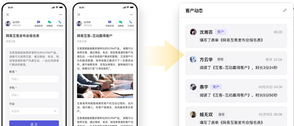 借助于網易互客,王先生的銷售團隊對于洞察客戶需求和狀態(tài),不再像從前那樣困難重重。網易互客設置了靈敏的“客戶雷達”功能,銷售人員可在平臺上創(chuàng)建文章、表單、文件和海報等豐富內容,通過微信等渠道一鍵下發(fā)給客戶。而客戶的閱讀和反饋情況也可及時反饋至平臺上,并生成統(tǒng)計,進而幫助銷售人員掌握客戶動態(tài),把握跟進時機。同時,王先生還可在分享的材料中添加名片,便于客戶及時聯(lián)系,為雙方創(chuàng)造互動契機。