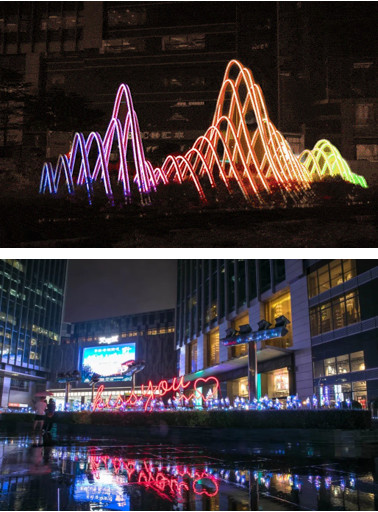 北廣場的山水光雕,每時(shí)每刻都在變換不同的色彩,如同坐地日行千里,群山綿延從眼前掠過;北廣場KISS YOU霓虹燈一直是永恒的主題。風(fēng)車舞動(dòng)、蜻蜓點(diǎn)水、山水變換,一切都比不了美人一笑。