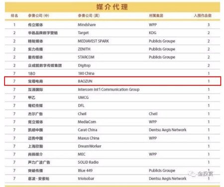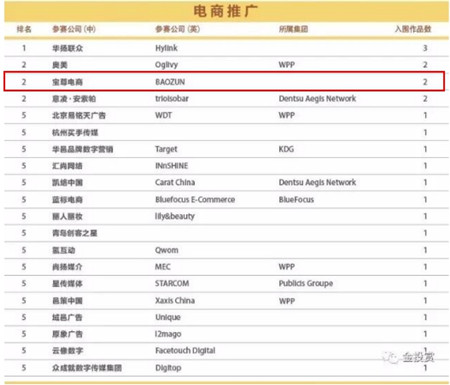 值得注意的是,在公布的入圍名單中不只有JWT(智威湯遜)、Ogilvy(奧美)等4A廣告公司,各類(lèi)獎(jiǎng)項(xiàng)入榜排名中不乏寶尊這樣的非傳統(tǒng)營(yíng)銷(xiāo)公司;且不難發(fā)現(xiàn),平均每個(gè)獎(jiǎng)項(xiàng)入圍公司的入圍作品也都只有一兩個(gè),競(jìng)爭(zhēng)異常激烈,由此可見(jiàn)數(shù)字營(yíng)銷(xiāo)市場(chǎng)格局正在發(fā)生轉(zhuǎn)變。