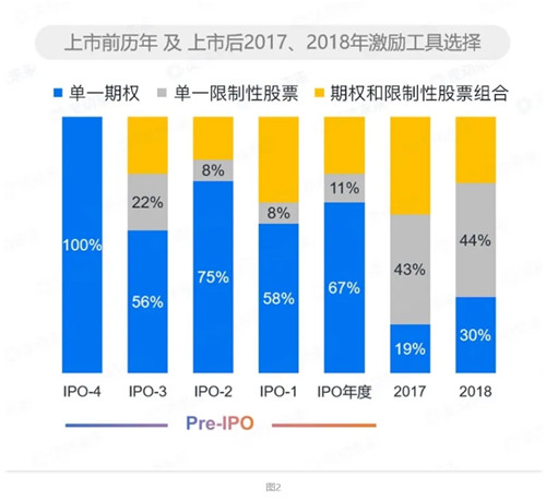 圖1顯示:樣本公司中,92%的樣本公司在上市前都采用了股票期權(quán),這其中有一半公司在授予期權(quán)的同時(shí),也授予了限制性股票。深究這類采用工具組合的公司,股票期權(quán)在組合中,仍是“主力”。圖2數(shù)據(jù)顯示:樣本公司在IPO前4年到IPO年度的發(fā)展歷程,是一個(gè)限制性股票逐漸出現(xiàn)的過(guò)程,公司一旦實(shí)現(xiàn)上市,限制性股票的使用普及度就會(huì)顯著增加,股票期權(quán)的普及程度則顯著下降。