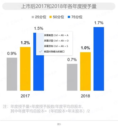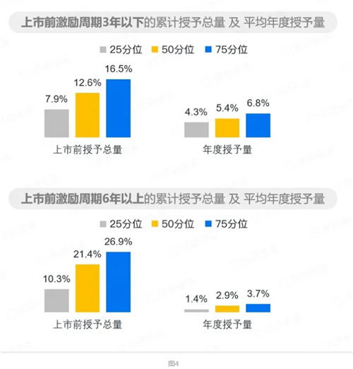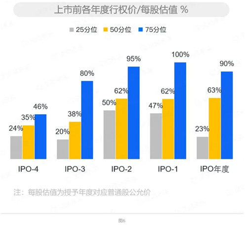 現(xiàn)實(shí)場(chǎng)景中,要想使股權(quán)激勵(lì)授予水平既設(shè)計(jì)得合理,又實(shí)施得有效,在設(shè)計(jì)和實(shí)施這兩個(gè)不同的工作階段,還要靈活運(yùn)用“股數(shù)”和“價(jià)值”這兩類數(shù)值,才可能達(dá)到預(yù)期效果。激勵(lì)資源的頂層控制是重中之重。從價(jià)值實(shí)現(xiàn)的角度,IPO前授予的股權(quán)激勵(lì),需要經(jīng)歷一個(gè)漫長(zhǎng)的賬面價(jià)值累積過(guò)程,直到公司實(shí)現(xiàn)IPO,激勵(lì)對(duì)象才具備了真正通過(guò)股權(quán)激勵(lì)獲得資本回報(bào)的機(jī)會(huì),是名副其實(shí)的“長(zhǎng)期激勵(lì)”。而IPO后授予的股權(quán)激勵(lì),激勵(lì)對(duì)象在解鎖后便可在二級(jí)資本市場(chǎng)實(shí)現(xiàn)激勵(lì)兌現(xiàn),因此IPO后授予的股權(quán)激勵(lì)相對(duì)偏向“中期激勵(lì)”。這樣的價(jià)值實(shí)現(xiàn)路徑差異,會(huì)影響到IPO前后,公司制定激勵(lì)水平方案的思考邏輯。在IPO前,從設(shè)計(jì)的角度更關(guān)注激勵(lì)池總量在規(guī)劃IPO前這段時(shí)間的合理配置;而IPO后,因?yàn)槊刻於加泄_的交易股價(jià),設(shè)計(jì)時(shí)更關(guān)注授予的價(jià)值是否能達(dá)到預(yù)期的激勵(lì)效果。圖3顯示:樣本公司在上市前累計(jì)授予的股權(quán)激勵(lì)總股數(shù)占上市前公司發(fā)行總股本比例的中位值為14.2%。年均下來(lái),每年授予股數(shù)占公司總股本比例的中位水平為3.7%。更進(jìn)一步的數(shù)據(jù)顯示:公司自首次實(shí)施股權(quán)激勵(lì)方案,至實(shí)現(xiàn)IPO經(jīng)歷的時(shí)間越久,IPO前累計(jì)授予的總量越高,但平均每年授予的水平越低。樣本公司的統(tǒng)計(jì)數(shù)據(jù)可見圖4。對(duì)于上市后的公司而言,因?yàn)榧?lì)對(duì)象從授予到可兌現(xiàn)的周期大大縮短,且上市后的股權(quán)激勵(lì)在解鎖后天然具備了流動(dòng)性,激勵(lì)的時(shí)間價(jià)值和流動(dòng)性溢價(jià)使得上市公司每年授予股權(quán)激勵(lì)的總量要低于非上市公司。圖5顯示:樣本公司上市之后,近兩年的股權(quán)激勵(lì)年度授予總股數(shù)占公司總股本的比例在1%左右。事實(shí)上,這個(gè)比例對(duì)于估值較高的公司而言,還要更低。早期公司估值偏低,但成長(zhǎng)性天然存在。對(duì)于高層的授予溝通,可以告知其獲授的激勵(lì)股數(shù)占公司總股本的比例,讓高層感受到在公司的重要程度。對(duì)于中基層的激勵(lì)對(duì)象,需要去傳遞與公司未來(lái)增長(zhǎng)目標(biāo)相對(duì)應(yīng)的激勵(lì)股份未來(lái)價(jià)值,通過(guò)這種溝通形式讓激勵(lì)對(duì)象在業(yè)務(wù)發(fā)展方向上形成統(tǒng)一認(rèn)知,同時(shí)讓大家感受到業(yè)務(wù)目標(biāo)達(dá)成后,今天授予的股權(quán)激勵(lì)在未來(lái)的價(jià)值區(qū)間,實(shí)現(xiàn)公司與激勵(lì)對(duì)象的長(zhǎng)期利益一致。隨著公司的發(fā)展壯大,甚至實(shí)現(xiàn)了IPO獲得了股票流動(dòng)性之后,在授予溝通時(shí),對(duì)于“激勵(lì)價(jià)值”的使用,就需要逐步從“未來(lái)價(jià)值”轉(zhuǎn)變?yōu)椤笆谟钑r(shí)價(jià)值”。一方面是因?yàn)槌墒旃镜脑鲋悼臻g天然“隱晦”,并不是所有的激勵(lì)對(duì)象都能夠感受得到,另一方面,當(dāng)股票能夠在二級(jí)市場(chǎng)自由交易時(shí),二級(jí)市場(chǎng)上展現(xiàn)出來(lái)的股票交易價(jià)值具備了足夠的“權(quán)威”,以至于其他的價(jià)值口徑,在溝通時(shí)都缺乏了說(shuō)服力。對(duì)于非上市公司的股票期權(quán)方案,經(jīng)典概念中用于激勵(lì)的股票期權(quán),是指“平價(jià)期權(quán)”,即行權(quán)價(jià)格跟授予日股票公允價(jià)值相當(dāng),激勵(lì)對(duì)象只能從授予后股價(jià)的上漲部分獲益。而在現(xiàn)實(shí)場(chǎng)景中,如果不存在硬性監(jiān)管規(guī)定,公司和激勵(lì)對(duì)象都會(huì)有意愿和動(dòng)機(jī)去壓低行權(quán)價(jià)格,在簡(jiǎn)單的數(shù)字邏輯中,期權(quán)行權(quán)價(jià)越低,激勵(lì)對(duì)象的獲益空間就會(huì)越高。圖6展示了樣本公司IPO之前授予的股票期權(quán)行權(quán)價(jià)相對(duì)于授予時(shí)每股股票公允價(jià)值的比例。數(shù)據(jù)顯示:早期公司授予股票期權(quán),行權(quán)價(jià)約為授予日股票公允價(jià)值的30%-40%,隨著公司逐漸接近IPO,這一比例也會(huì)逐步上升,在IPO前夕授予的股票期權(quán),行權(quán)價(jià)相對(duì)于授予日公允價(jià)值比例的中位值為63%。在圖6的數(shù)據(jù)之外,我們也察覺到越來(lái)越多的,當(dāng)前尚未上市的公司在授予股權(quán)激勵(lì)時(shí),開始采用大折扣的行權(quán)價(jià)設(shè)定,甚至是一分錢象征意義的行權(quán)價(jià)安排。也就是說(shuō),如果再過(guò)二、三年,這些公司能夠?qū)崿F(xiàn)IPO的話,圖六所示的比例會(huì)下降。雖然從簡(jiǎn)單的數(shù)字邏輯來(lái)看,低行權(quán)價(jià)期權(quán)能夠傳遞較高的激勵(lì)價(jià)值。但在實(shí)際場(chǎng)景中,低行權(quán)價(jià)期權(quán)能否更“接近靶心”,卻不是一個(gè)簡(jiǎn)單的數(shù)學(xué)運(yùn)算能夠解釋的問(wèn)題。非上市公司的股權(quán)激勵(lì)價(jià)值帶
