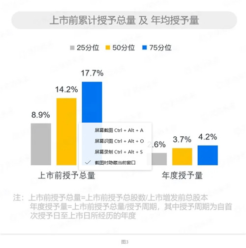 回顧歷史,限制性股票的首次引入大多出現(xiàn)在公司上市之后,但隨著一級(jí)資本市場(chǎng)的日漸繁榮,近年來(lái)很多公司在上市之前就已經(jīng)達(dá)到了極高的估值水平,因此我們看到越來(lái)越多的公司在上市前就引入了限制性股票做為激勵(lì)工具。但對(duì)于沒有明確上市計(jì)劃的高估值公司而言,我們建議謹(jǐn)慎使用限制性股票作為激勵(lì)工具,這是考慮到在中國(guó)境內(nèi)稅制下,對(duì)限制性股票納稅時(shí)點(diǎn)的規(guī)定。在VIE架構(gòu)下,有中國(guó)境內(nèi)納稅義務(wù)的員工被授予限制性股票之后,在股票解禁時(shí)就會(huì)產(chǎn)生個(gè)人所得稅納稅義務(wù),如果股票解禁時(shí)公司還未上市,就會(huì)出現(xiàn)員工需要拿出現(xiàn)金繳稅,但解禁的股票還不可拋售兌現(xiàn)的情景,反而會(huì)影響激勵(lì)效果。激勵(lì)多少——授予水平的確定