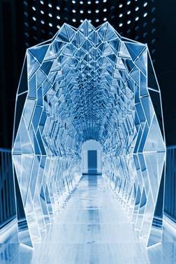 在地面和隧道的一側(cè)打造成深淵燈的樣式,另一側(cè)打造幾何切割的玻璃面。打造出更為深入人心,沉浸式的虛擬世界。猶如進(jìn)入盜夢(mèng)空間一般。