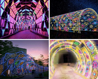 圓拱形光隧道,非常適合打造形制對(duì)稱(chēng)的藝術(shù)走廊,設(shè)計(jì)師們?cè)诨⌒蚊姘逯凶⑷胱约旱乃囆g(shù)創(chuàng)想,或以斑斕色塊營(yíng)造童趣想象,或以燈畫(huà)展示多彩世界,讓穿梭于此的行人,都能身臨其境感受美好意境。