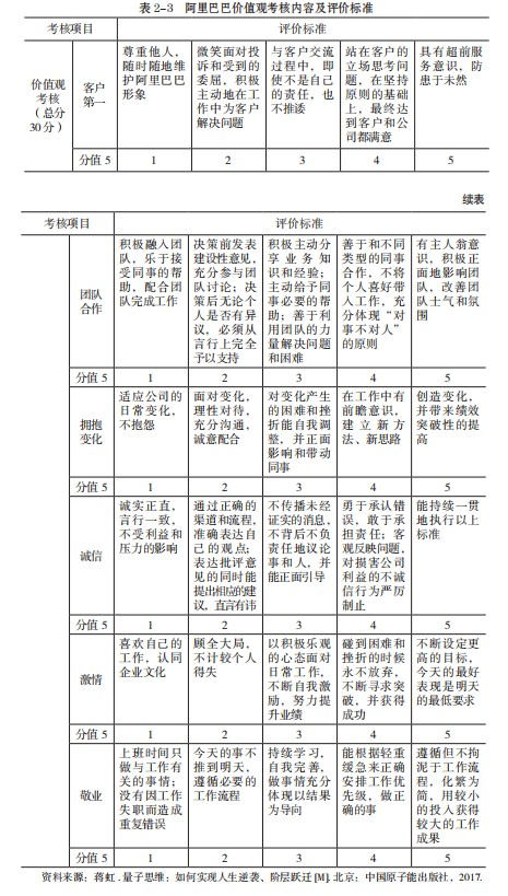 表 2-3 列出了阿里巴巴價(jià)值觀的六項(xiàng)內(nèi)容:客戶第一、團(tuán)隊(duì)合作、擁抱變化、誠(chéng)信、激情和敬業(yè)。難能可貴的是,阿里巴巴分別針對(duì)每項(xiàng)內(nèi)容設(shè)計(jì)了具體的評(píng)價(jià)標(biāo)準(zhǔn)。