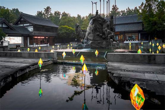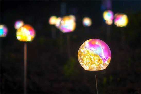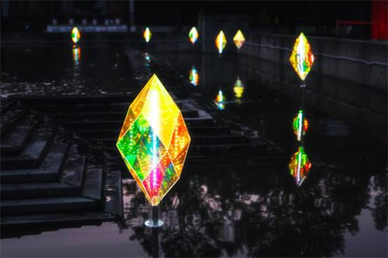 在景區(qū)內(nèi)的水池中,以繽紛琉璃晶石進(jìn)行水池區(qū)域氛圍營(yíng)造,迎合周邊DP裝置主題,晶石形燈光置放水池之中,夜色中,水池區(qū)域在晶石燈飾的閃爍下瞬間提亮,抓人眼球。