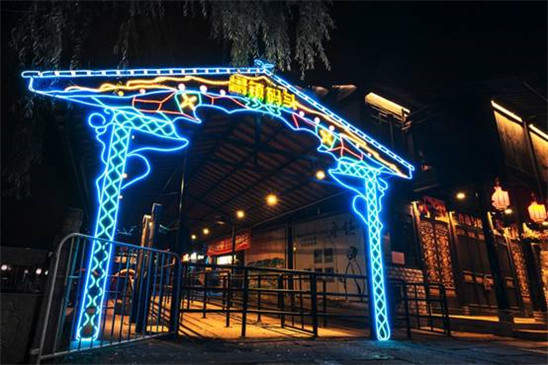 在魯鎮(zhèn)碼頭,夜空彩虹采用柔性燈帶,沿著碼頭牌坊輪廓打造夜景燈飾,以熒光藍(lán)色為主體,展示“魯鎮(zhèn)碼頭”地標(biāo)信息,指引夜游的游客在此處購(gòu)票登船。