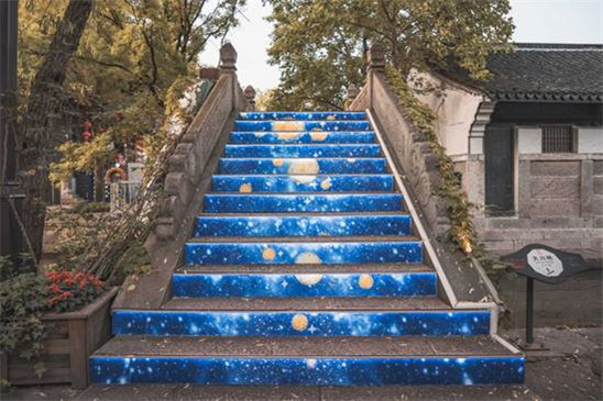 紹興柯巖景區(qū)河網(wǎng)密布,隨處可見(jiàn)河流與古橋,步行至魯鎮(zhèn)景區(qū)的近河畔處,古香古色的橋梁靜臥河面,恬靜不失雅趣。在橋梁階梯處,燈畫帶來(lái)了美麗的星空效果。
