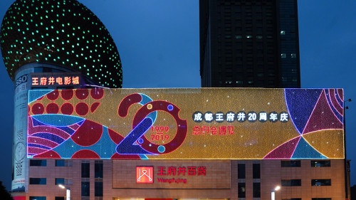 (2019年,夜空彩虹用星星燈為成都王府井百貨所作20周年慶燈飾畫)