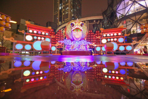 (由夜空彩虹打造的龍湖重慶時(shí)代天街“夢回大唐”獅頭裝置)