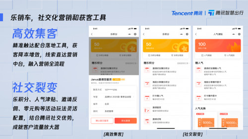 不止于數據和分析,騰訊數字化營銷體系還提供了樂銷車產品,它是社交化營銷和獲客工具,會使營銷過程更生動、更有趣、更易被用戶接受。樂銷車支持樂積分、人氣津貼、邀請反傭、零元購等活動玩法,通過社交化裂變,最大程度上獲取高質量的潛客。樂銷車還能高效集客,大數據分析后銷售線索直達銷售中臺,融入到營銷的全流程,可用作簡單的收集、發(fā)券核銷,也可以成為任務發(fā)布或接收平臺,主機廠以CPL或CPS的方式監(jiān)測營銷費用的效率。