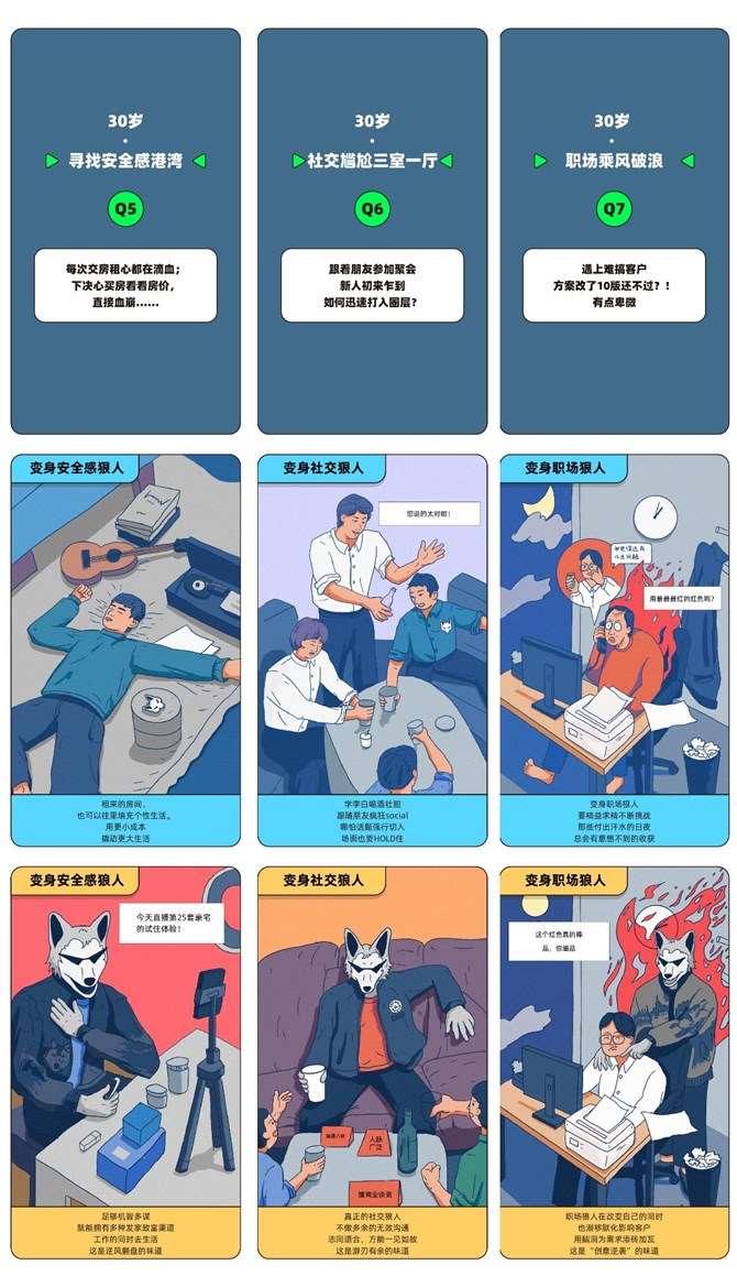 條漫以"狠人"和"狼人"的對(duì)比為主線展開,點(diǎn)出了年輕人在面對(duì)30歲大關(guān)時(shí)所要面臨的多種社會(huì)化場(chǎng)景和困境,包括如何在職場(chǎng)乘風(fēng)破浪、新人如何快速打入朋友的社交圈、如何在"老大不小"的年紀(jì)里尋求安全感、如何應(yīng)對(duì)七大姑八大姨的催婚急急如律令……